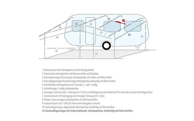 Dachauflagestangen mit Federstahl-Ende teleskopierbar, beidseitig mit Rohrschellen.